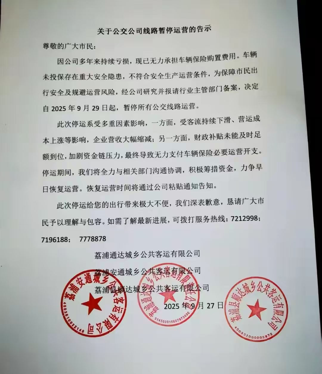 9月27日,广西桂林荔浦市的三家城乡公共客运公司——通达、安通和顺达,联合发布了一份《关于公交公司线路暂停运营的告示》(以下简称停运告示)。