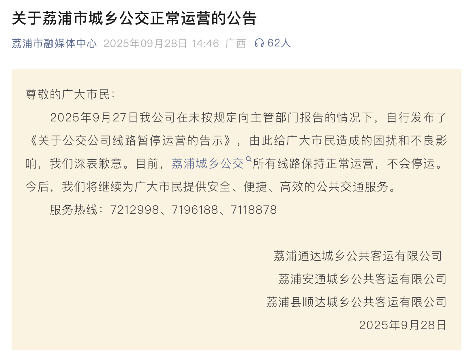 公告称,荔浦城乡公交所有路线保持正常运营。