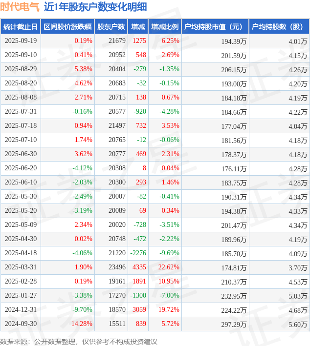 从股价来看,2025年8月29日至2025年9月19日,时代电气区间涨幅为0.19%,在此期间股东户数增加1275.0户,增幅为6.25%。